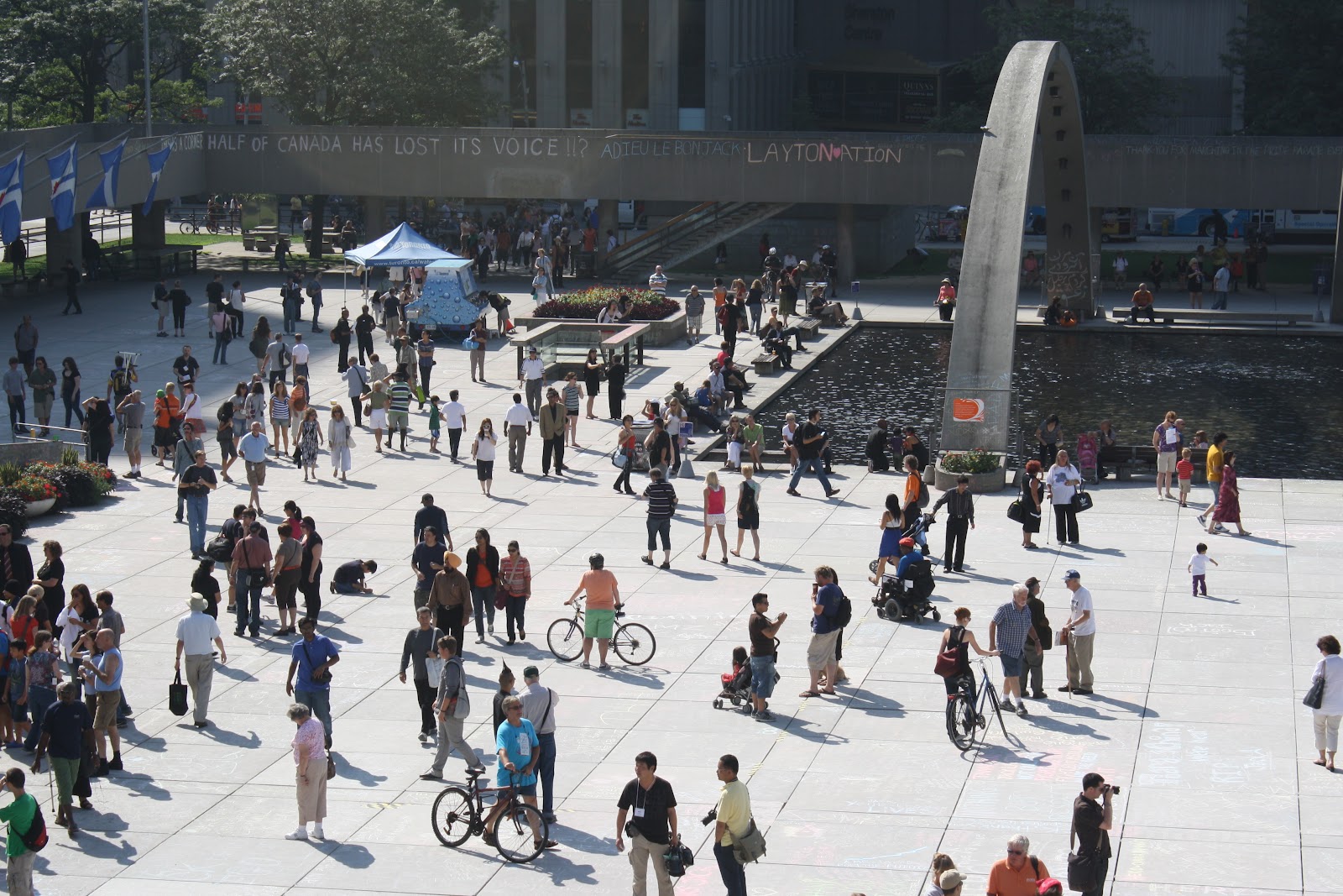 ジャック・レイトンの国葬が予定されていた土曜日、市役所のコンクリートいっぱいに書かれた市民からのメッセージを前に、彼の生き方、そして死がどれほどカナダ国民の心を深く揺り動かしたかに気付いてハッとした。